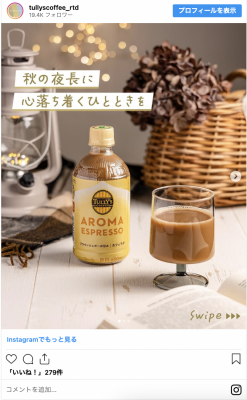 | 効果 | ・キャンペーン応募人数1.8万人を実現! ・CPCが想定の約1/3に!広告運用により14,663名のフォロワーを獲得! ・写真707枚・動画22本の撮影素材収集に成功 ・「#今日もタリーズと一緒」の投稿が144件集まり、UGCの土台作りに貢献 |