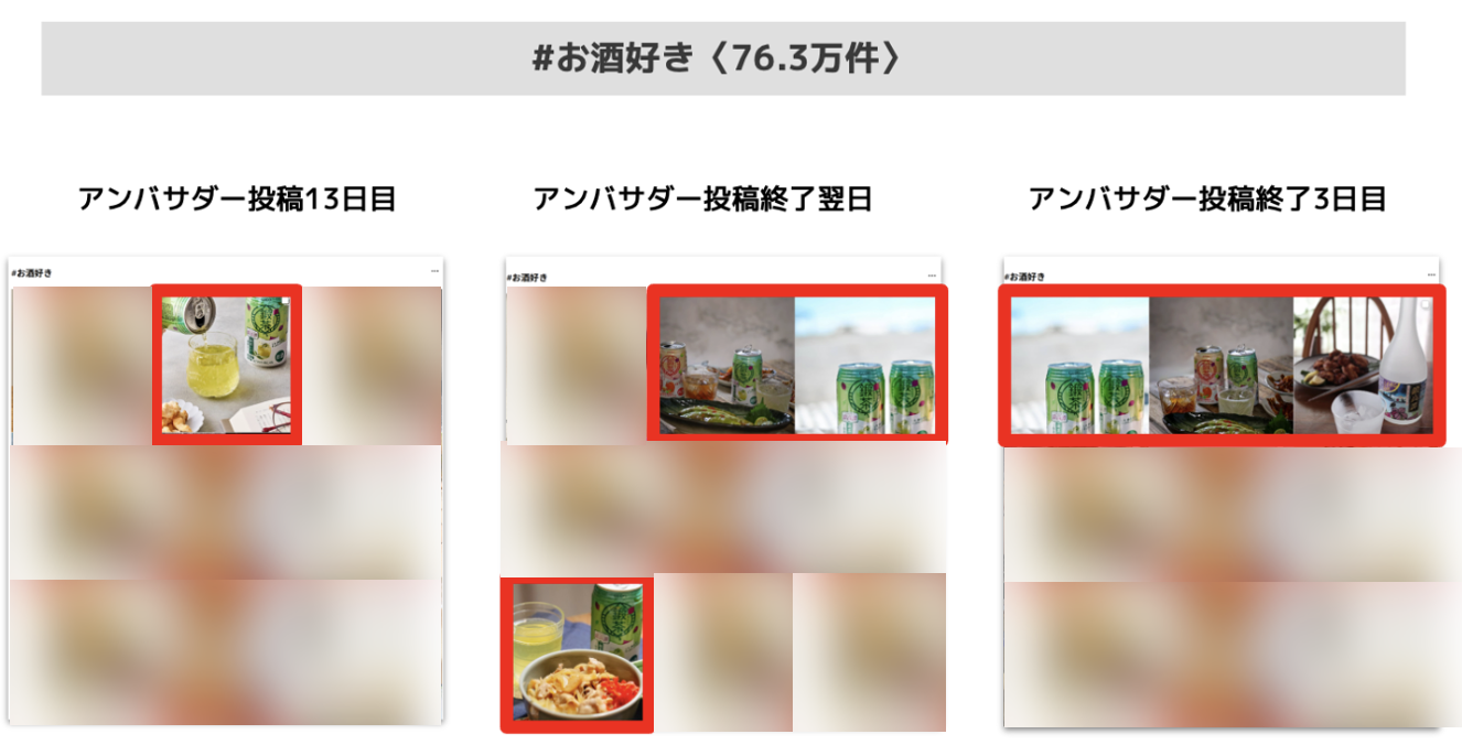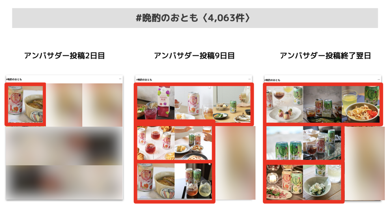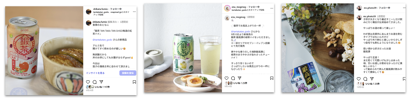 | 成果 | ・一般ユーザーに近いアンバサダーにより、「鍛茶缶」と晩酌シーンでの多くの画像、動画投稿がなされたことにより、リーチを獲得し、認知拡大に寄与しました。 ・関連ハッシュタグで多くの投稿が上位にランクインするなど、検索結果の受け皿を作ることができました。 ・収集した画像/動画素材をオーガニック投稿の制作に活用することができました。 |