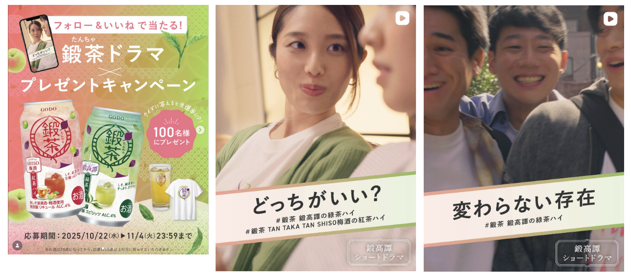 合同酒精株式会社様では、新商品「鍛茶缶」発売に合わせて、自社SNSアカウントでのフィード・リール投稿、ショートドラマの制作、ショートドラマ連動キャンペーン、アンバサダー施策、広告運用など複数施策を統合的に支援させていただきました。