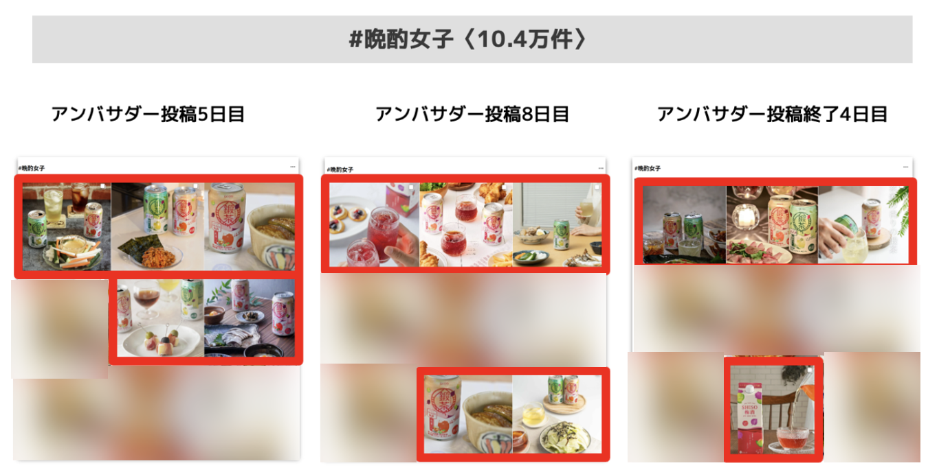 | アンバサダープラン | 「#晩酌女子」「#お酒好き」などでのハッシュタグ検索の受け皿作り、オーガニック投稿で資料する素材の収集、ターゲットへの質の高いリーチを役割として実施。 |