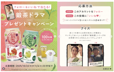 ショートドラマの公開を記念して、抽選で鍛茶缶2種とオリジナルグッズが合計100名様に当たるキャンペーンを実施しました。