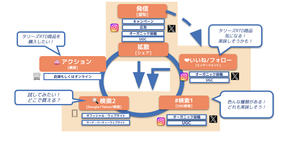 SNSはブランドの“想起と選ぶ理由”を作るメディアだと捉えています。タリーズRTDは、TVCMや店頭、そしてタリーズショップという強いブランド接点を持っています。だからこそSNSは、その世界観を補完し、RTDとショップ体験をつなぐ役割を担う必要があると考えます。
