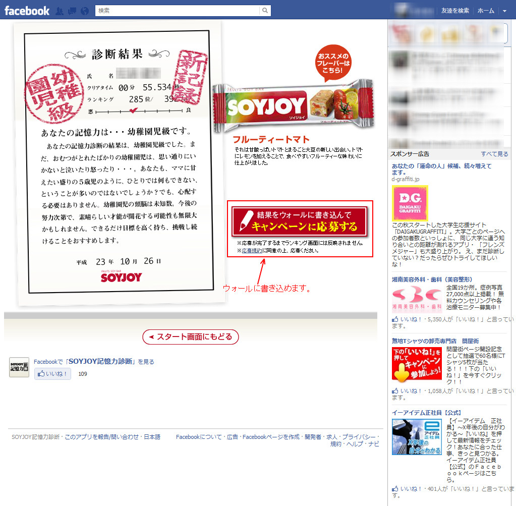 結果発表画面の「ウォールに投稿する」をクリックすると書き込むことができます。