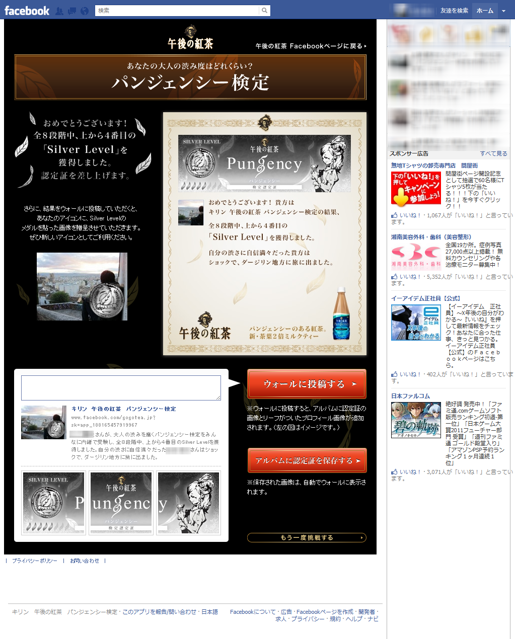 結果発表画面の「画像を保存してあなたのウォールへ投稿する」をクリックするとウォールに以下のように書き込めます。