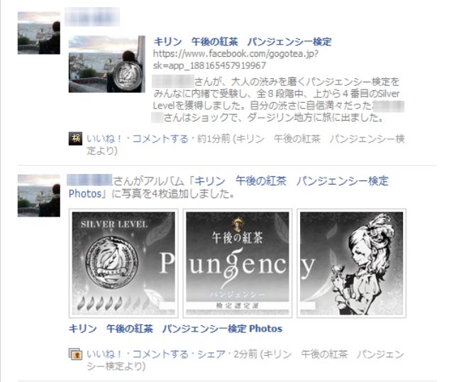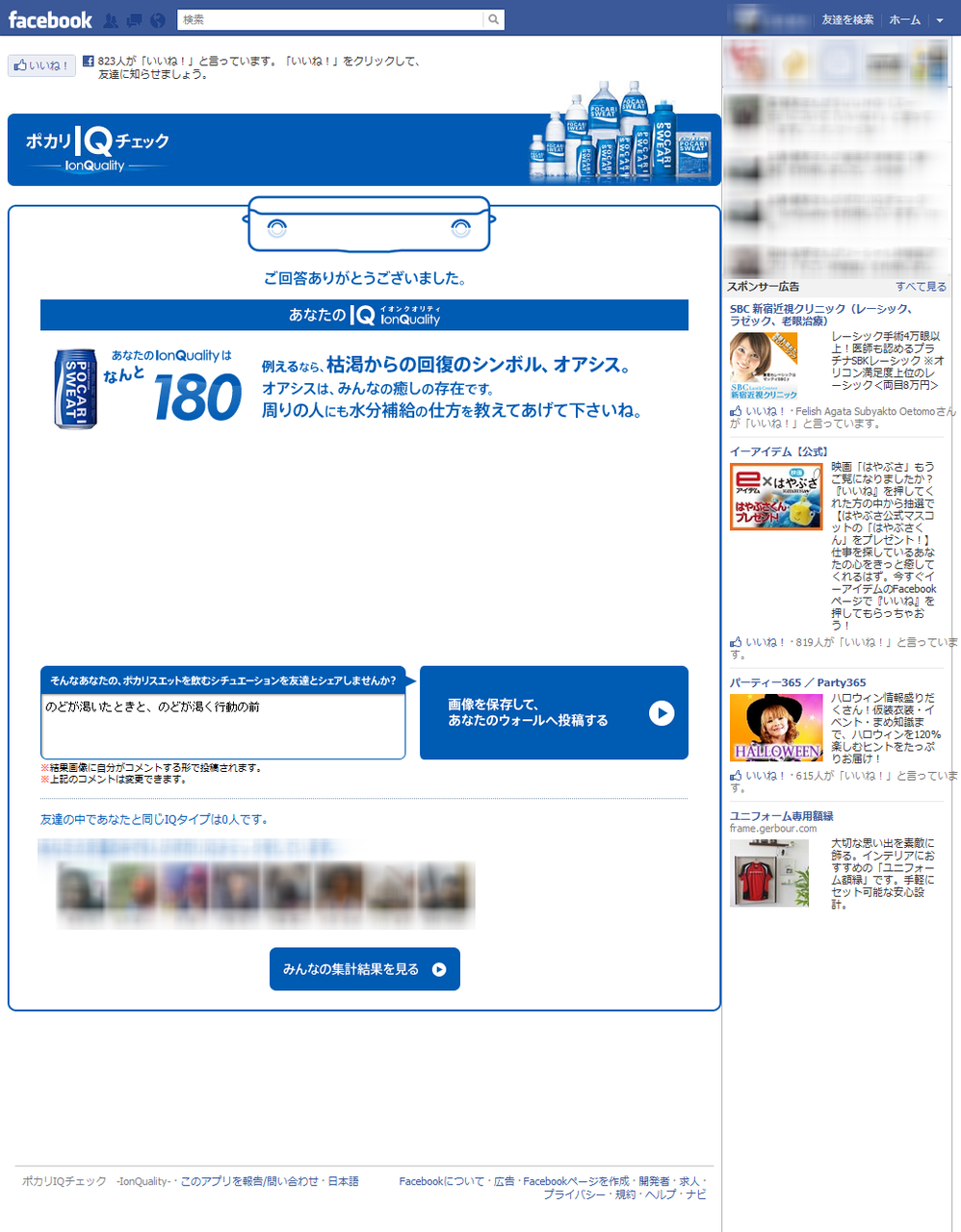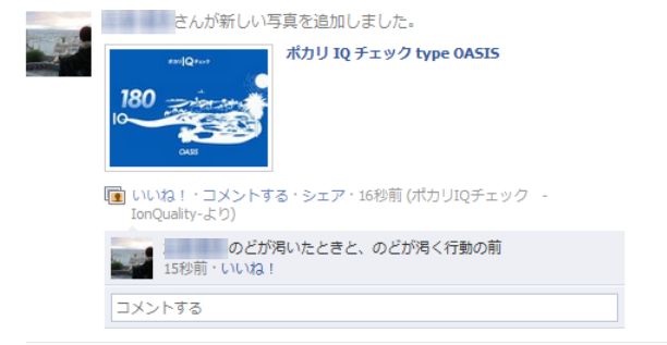 ポカリのIQ診断がFacebook上でバイラルした時も、「○○さん、乾いてますねw」といったコメントの応酬が各所で行われていたと思います。コメントが付くと、その投稿のエッジランクも上がり、より多くの友達に表示されるようになるので、バイラル性を高められています。