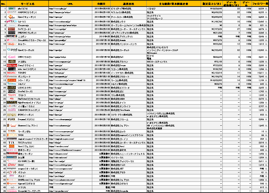 ※ 「グルーポン系サイト」と言われるサイトは、他にも『ギリギリ!マーケット』『toku・pin(トクピン)』『Buyなう』『NEUTRAL』『group割』『もしフェス』がありますが、弊社の考えるグルーポン系サイトの定義(リアル店舗のクーポン販売)とは違ったので、リストから抜いています。