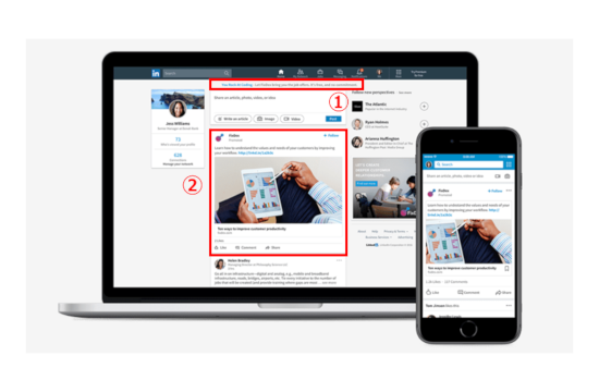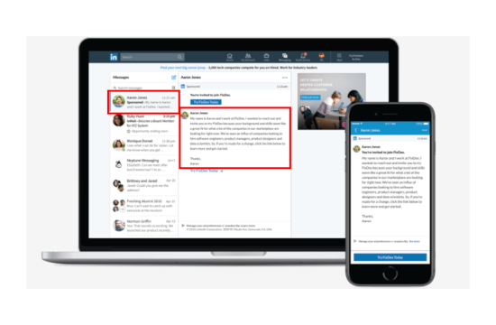 LinkedInのメッセージ内に表示されます。メッセージ広告と会話型広告の2種類があります。