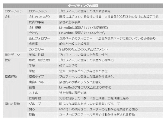 LinkedInのデータベースに登録されたユーザーの職種や役職名によってターゲット化します。