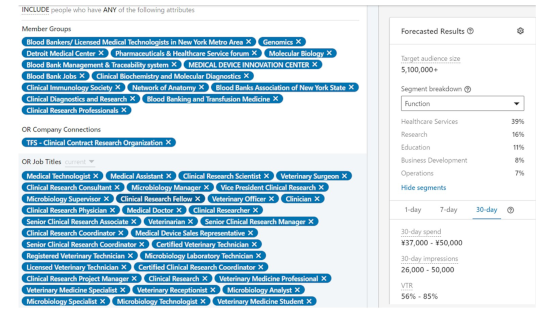 また、LinkedInのプロフィールには仕事に関係するあらゆる情報を登録するので、企業側はそういったセグメントを細かく設定してターゲットに効率よく広告を届けられます。