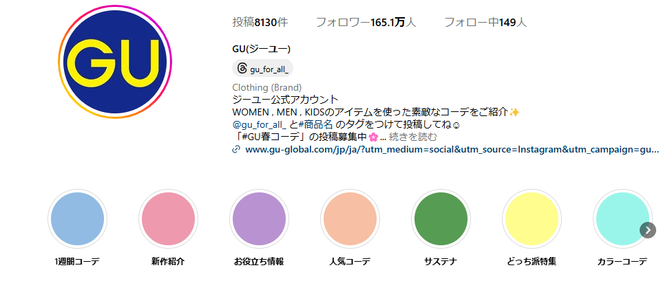 GUは、インスタグラムのファッション系インフルエンサーとコラボし、自社商品のコーディネートを紹介しています。