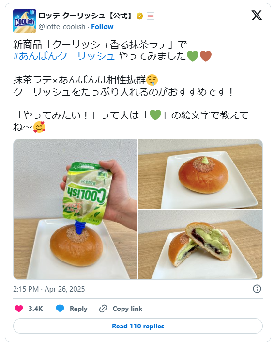 クーリッシュのSNS運用事例では、相性の良い組み合わせ提案が大きな魅力となりました。例えば、「抹茶ラテ×あんぱん」というペアは、納得感のある組み合わせで、ユーザーが思わず試したくなるような提案でした。これにより、クーリッシュを新たな食べ方で楽しむことができ、商品の魅力が自然に伝わりました。