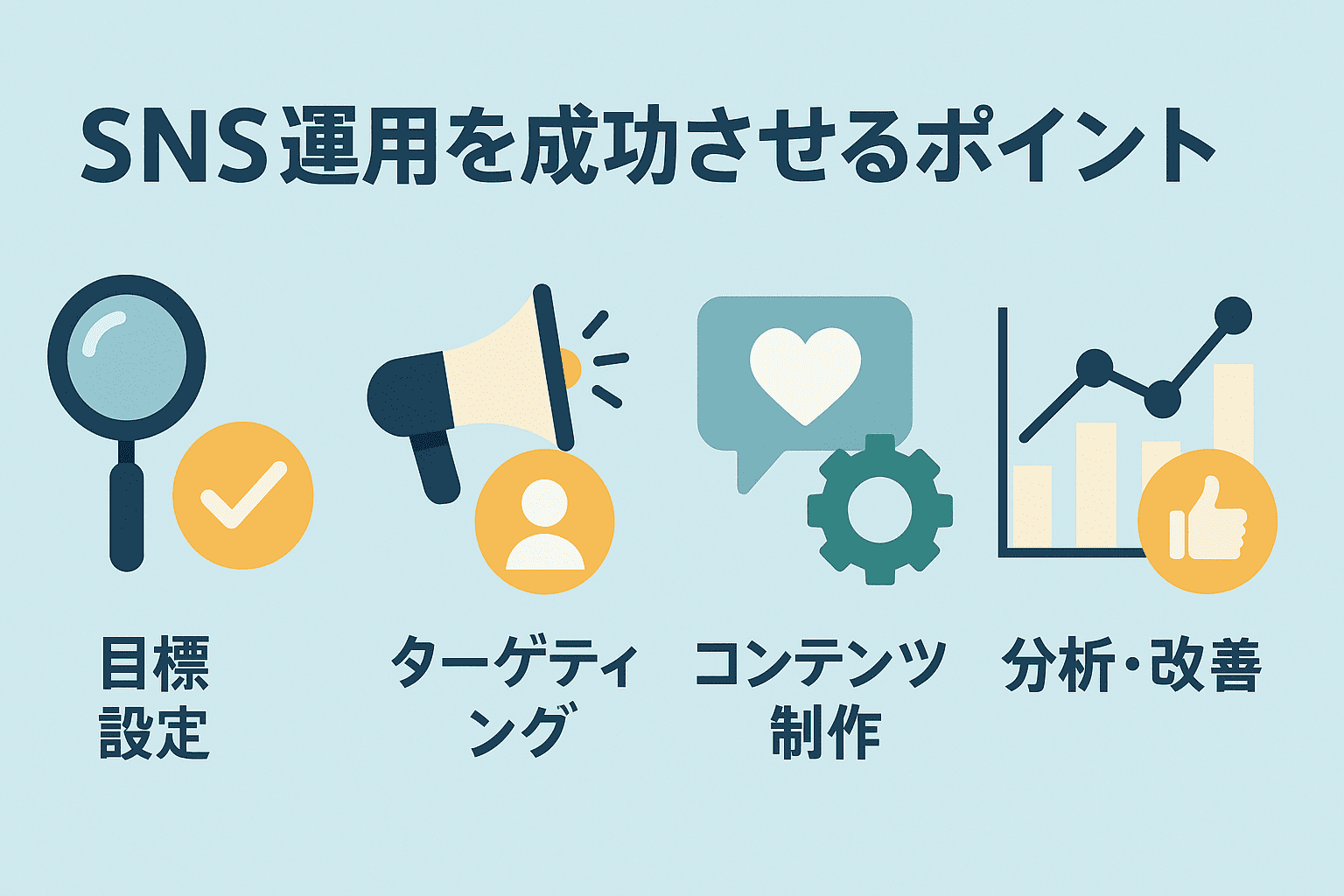 SNS運用を成功させるには、目標設定、ターゲット設定、エンゲージメント向上のための適切な施策が必要です。継続的な改善と効率化を実現するAIツールの活用を視野に入れることで、運用の成果を最大化することができます。