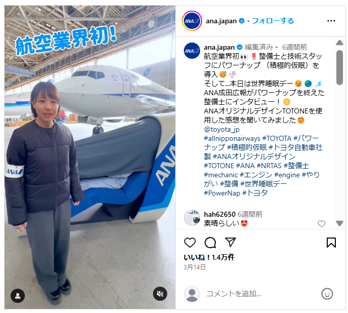 コメント欄では「社員に優しい」「うちにも欲しい」「素晴らしい取り組み」といったポジティブな反応が多く寄せられ、ANAの企業イメージは一層好印象を与えました。視覚的にも斬新な仮眠ベッドや整備士のリアルな表情を捉えたビジュアルが印象的で、フィード上で目を引く構成となっています。