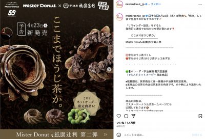 ミスタードーナツのこの投稿は、「ここまでほうじ茶か。」という目を引くフレーズ、高級感あるビジュアルで商品の魅力を的確に伝えています。