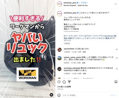 このワークマンの投稿は、商品の特徴である「シューズやヘルメットも収納できる」という具体的なメリットを、分かりやすい短い動画を使って視覚的に伝えています。