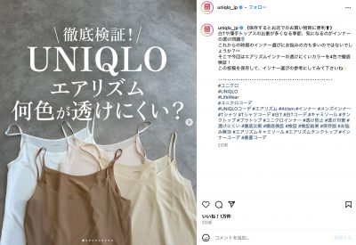 ユニクロの成功例です。この投稿が好事例である理由は、季節に合わせてユーザーが抱える「インナーの透け問題」という悩みに着目し、具体的な方法(エアリズムインナーのカラー比較)で課題解決型の情報を提供している点です。