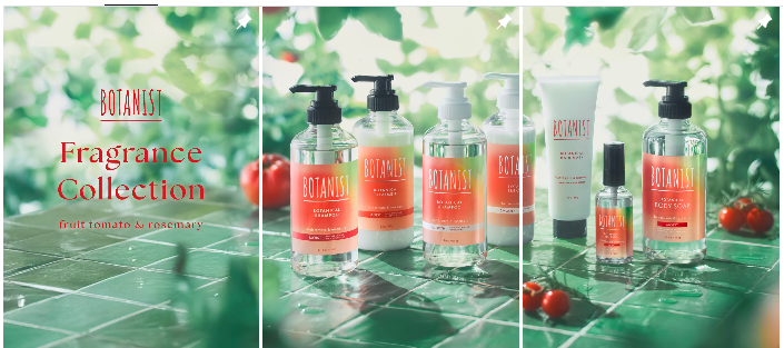 BOTANISTは、「Fragrance Collection」をテーマに、フレッシュなグリーンの背景とみずみずしいトマトをアクセントにした9分割のグリッド投稿を展開しています。
