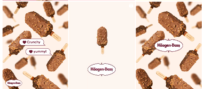 ハーゲンダッツは、アイスバーを主役にした3×3のグリッド投稿を展開。中央にシンプルに一つのアイスを配置し、周囲には同じアイスがポップに散りばめられています。コメントで「Crunchy」「Yummy!」といった言葉を添え、遊び心を演出しています。