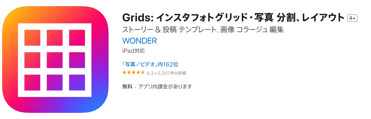 分割方法のバリエーションが豊富なアプリです。基本的には無料ですが、分割後の画像に「Instagrads」のロゴが入ってしまうので、企業として利用する場合は有料版を推奨します。