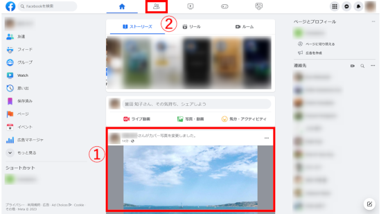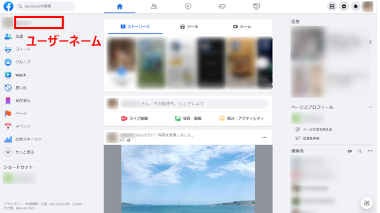 Facebookにログインすると表示されるページです。ニュースフィードには友達やファンになったFacebookページの投稿が表示されます。ニュースフィードのほかに、ホーム画面と呼ばれることもあります。