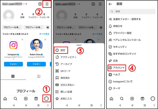 ②プロフィールページ右上にあるハンバーガーメニューをタップ