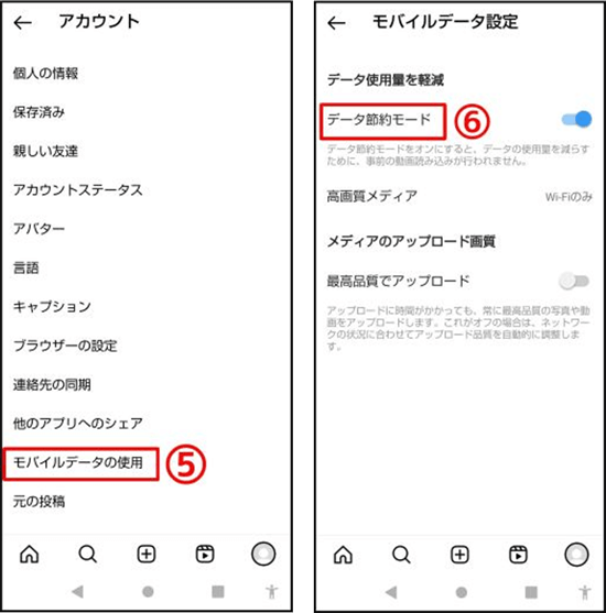 ※「データ節約モード」がオンになっていると、事前の動画読み込みが行われません。さらに「高画質メディア」をタップすると、「オフ」「Wi-Fiのみ」「モバイルデータ+Wi-Fi」から設定を選択することができます。