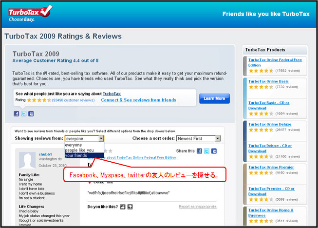Facebook、Myspace、X(Twitter)との連携をする事により、各ソーシャルメディア上の友人のレビューを表示してくれます。