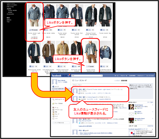 こちらは、よくLevi’sの事例でも紹介されますが、自分の友人がどの商品に対してLikeボタンを押したか分かります。